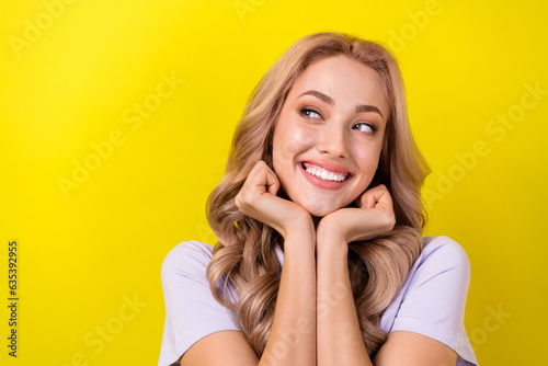 Photo of dreamy adorable lady wear purple polo showing arms cheeks looking empty space isolated yellow color background