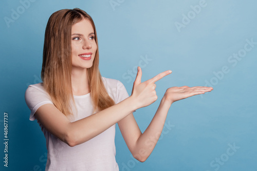 Photo of dreamy confident lady hold palm presenting empty space indicate forefinger on blue color background