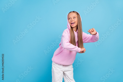 Photo of dreamy curious cool positive young small girl look empty space enjoy dance funky good mood blue color background