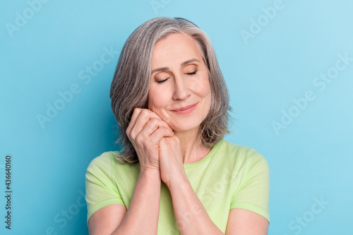 Photo of dreamy sleepy old calm woman closed eyed good mood isolated on pastel blue color background