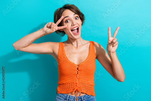 Photo of eccentric woman with short hairdo dressed knitwear singlet showing v-sign symbol on face isolated on turquoise color background