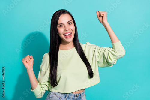 Photo of ecstatic lady celebrate luck advertisement raise fists up isolated over cyan color background