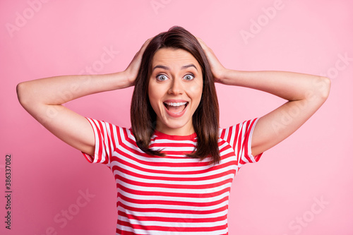 Photo of excited happy brunette straight hair lady hands head wear red white cloth isolated over pastel pink color background