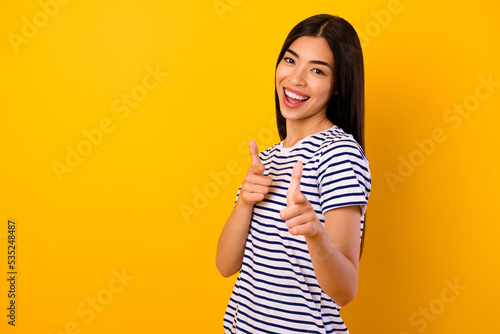 Photo of excited pretty lady wear striped t-shirt pointing fingers you empty space isolated yellow color background