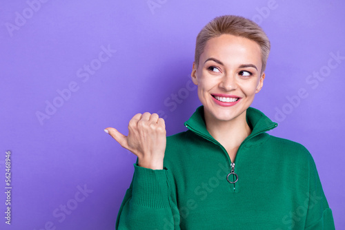 Photo of funky dreamy woman dressed green pullover looking pointing thumb empty space isolated purple color background