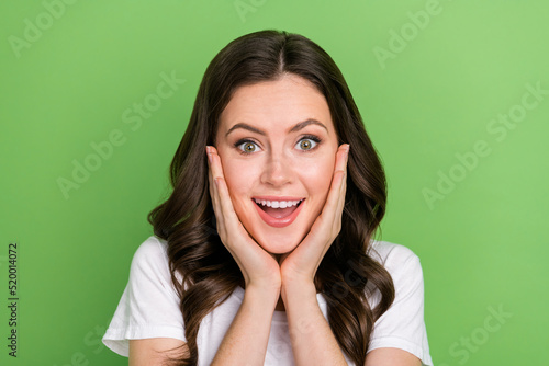 Photo of funky dreamy young lady wear white t-shirt arms cheeks smiling isolated green color background