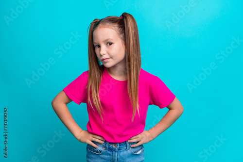 Photo of funky schoolchild put hands waist listen interested chatting isolated on cyan color background