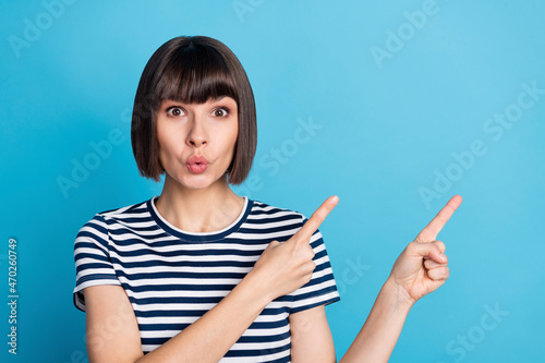 Photo of funny brunette young lady point empty space wear striped t-shirt isolated on blue color background