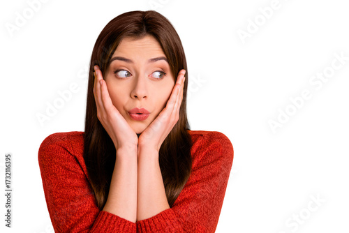 Photo of funny cute charming pretty youngster having made mistake and now whistling pretending that nothing happened with lips pouted isolated over vivid color background