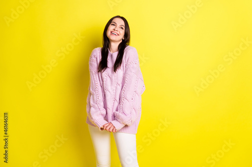 Photo of generation z shy brown hairdo lady look up empty space wear pink sweater isolated on vivid yellow color background