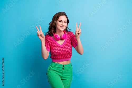 Photo of glad lovely lady wear trendy clothes demonstrate v-sign greeting symbol hello cool party isolated on blue color background