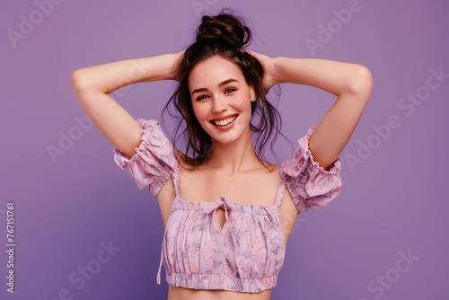 Photo of glad positive irish woman wear stylish clothes two arms touch head wow summer sale isolated on purple color background