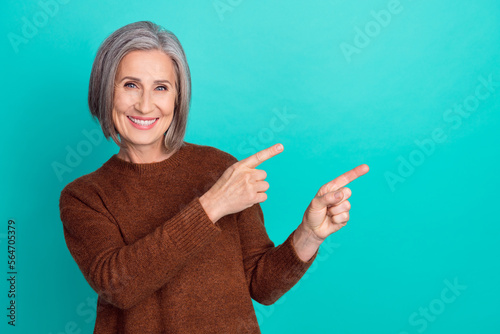 Photo of gorgeous glad lady wear brown stylish clothes arm direct empty space seasonal sale proposition isolated on cyan color background