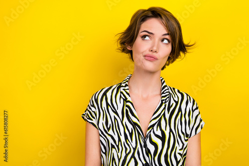 Photo of gorgeous minded girl with bob hairdo dressed zebra print shirt thoughtfully look empty space isolated on yellow color background