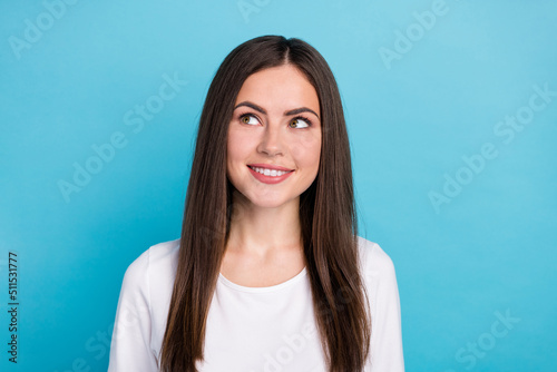 Photo of gorgeous nice looking female look empty space dreaming about weekend vacation isolated on blue color background
