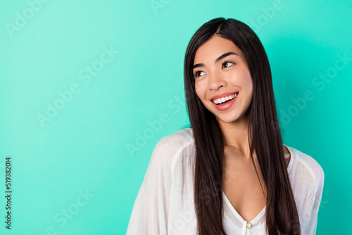 Photo of gorgeous positive person toothy smile look interested empty space isolated on shine aquamarine color background