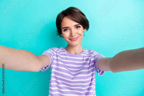 Photo of gorgeous pretty funny nice girl with bob hairstyle dressed striped t-shirt arm cover eye isolated on teal color background