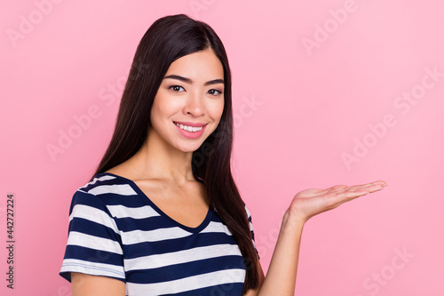 Photo of gorgeous young lady hold empty space wear striped t-shirt isolated on pastel pink color background