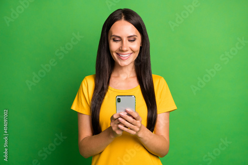 Photo of happy charming young woman hold phone read message wear yellow t-shirt isolated on vibrant green color background