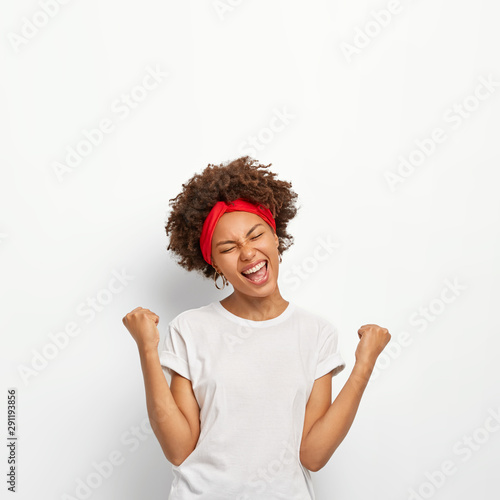 Photo of happy delighted Afro girl clenches fists, feels triumph, rejoices victory, keeps eyes shut, smiles broadly, wears white t shirt, stands indoor. Yes, I did it successfully. People, high spirit