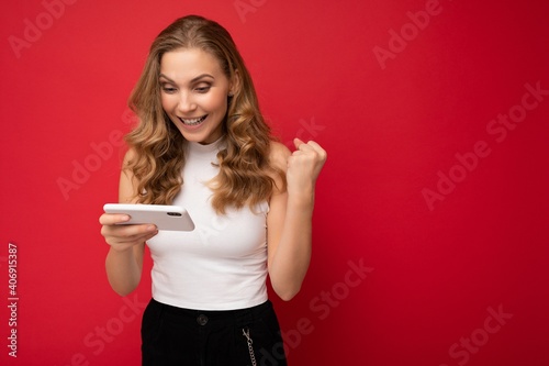Photo of happy smiling concentrated beautiful young blonde woman wearing white t-shirt isolated on red background using smartphone and playing phone games looking at gadjet screen and showing yes