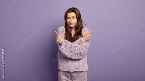 Photo of hesitant woman with puzzled facial expression points sideways, indicates two objects on right and left, cant make choice, faces doubtful situation, has unsure look, wears oversized jumper