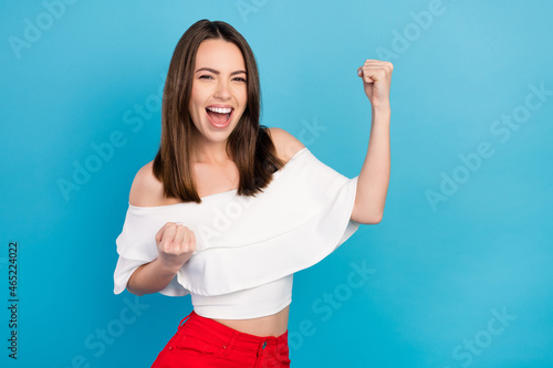 Photo of hooray brunette young lady hands fists yell wear white top jeans isolated on blue color background