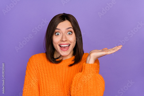 Photo of impressed crazy girl open mouth arm hold empty space proposition isolated on violet color background