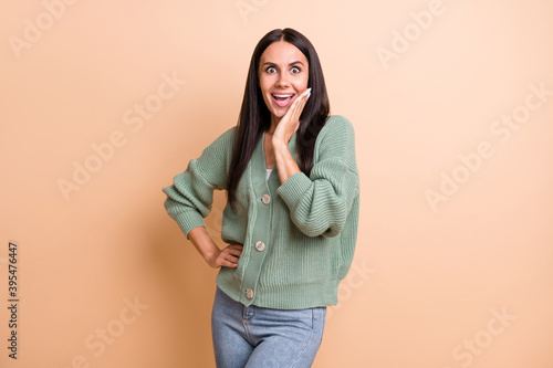 Photo of impressed cute girl hand mouth wear green sweater jeans hand waist isolated on peach color background