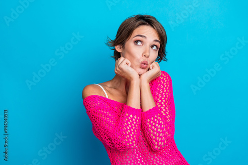 Photo of impressed positive lady dressed knitted pink shirt arms cheeks looking empty space isolated blue color background