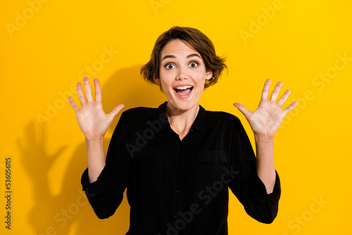 Photo of impressed young short hair lady hands up wear black shirt isolated on yellow color background