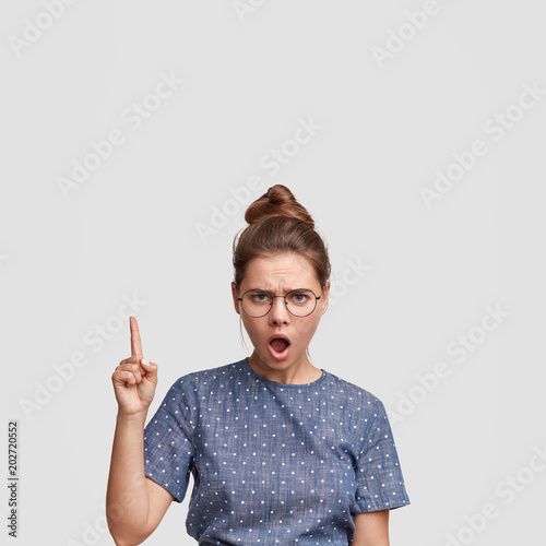 Photo of irritated angry lovely woman has upset look, being discontent with something, points at blank copy space for your advertising content or promotional text. People and negativity concept