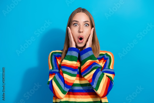 Photo of lovely adorable girl open mouth wear stylish striped colorful clothes sale isolated on blue background