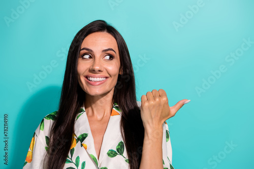 Photo of lovely cheerful satisfied girl wear stylish clothes arm direct empty space news proposition isolated on cyan color background