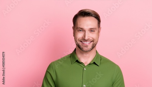 Photo of lovely crazy cheerful woman jump up wear green stylish clothes isolated on pink color background