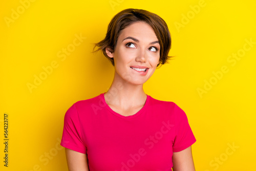 Photo of lovely cute lady wear pink stylish clothes look up special offer empty space banner isolated on yellow color background