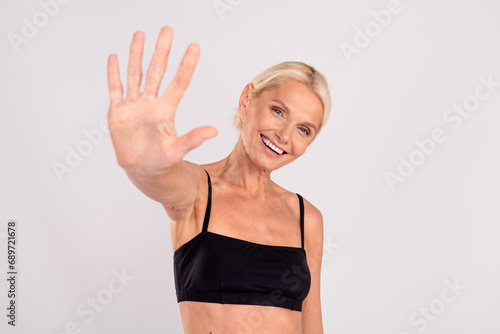 Photo of lovely friendly aged lady toothy smile arm palm give you high five isolated on grey color background