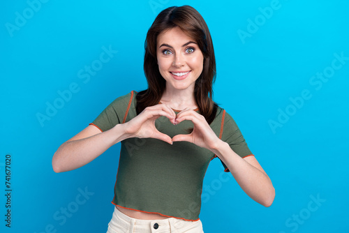 Photo of lovely friendly lady toothy smile hands fingers demonstrate heart symbol isolated on blue color background