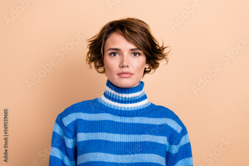Photo of lovely nice young girl calm face new haircut isolated on pastel beige color background