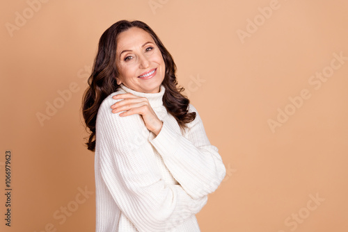 Photo of lovely pretty woman wear white stylish clothes hug herself isolated on beige color background
