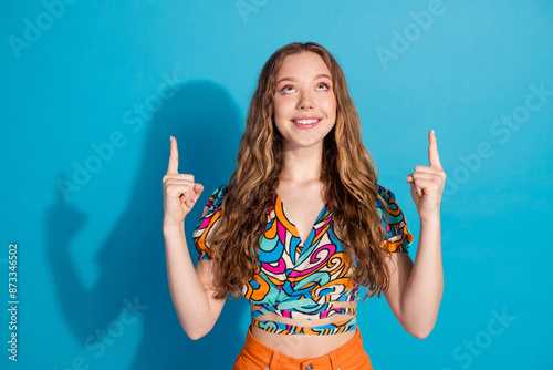 Photo of lovely young girl look indicate fingers up empty space wear top isolated on teal color background