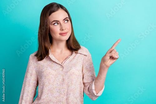 Photo of lovely young woman look curious finger point empty space dressed stylish smart casual look isolated on aquamarine color background