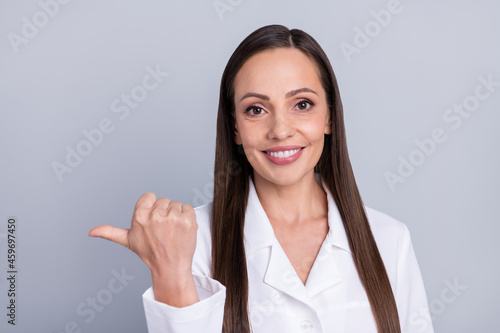 Photo of mature woman happy positive smile point thumb empty space ad promo suggest clinic isolated over grey color background