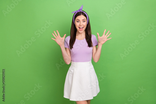 Photo of millennial brunette lady play wear violet t-shirt band skirt isolated on green color background