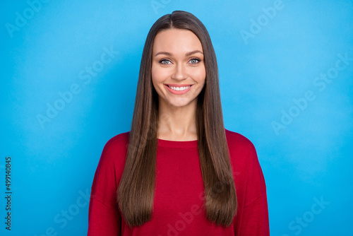 Photo of millennial nice brunette lady wear red sweater isolated on blue color background