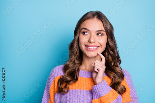 Photo of minded happy young lady hold finger think look empty space isolated on pastel blue color