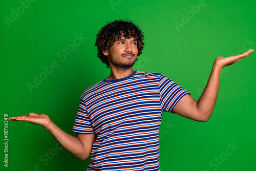 Photo of minded man wear trendy striped clothes demonstrate empty space novelty isolated on green color background