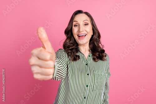 Photo of nice aged lady show thumb up wear striped shirt isolated on pink color background
