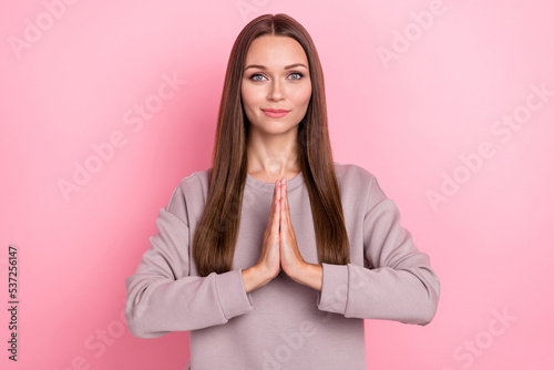 Photo of nice calm dreamy lady arm hold together appreciate help dressed trendy pullover isolated on pink color background