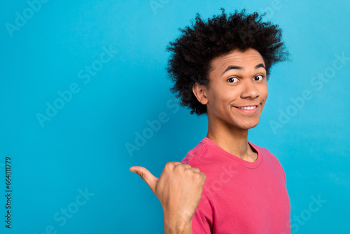 Photo of nice cool satisfied guy wear pink stylish clothes thumb demonstrates empty space proposition isolated on blue color background